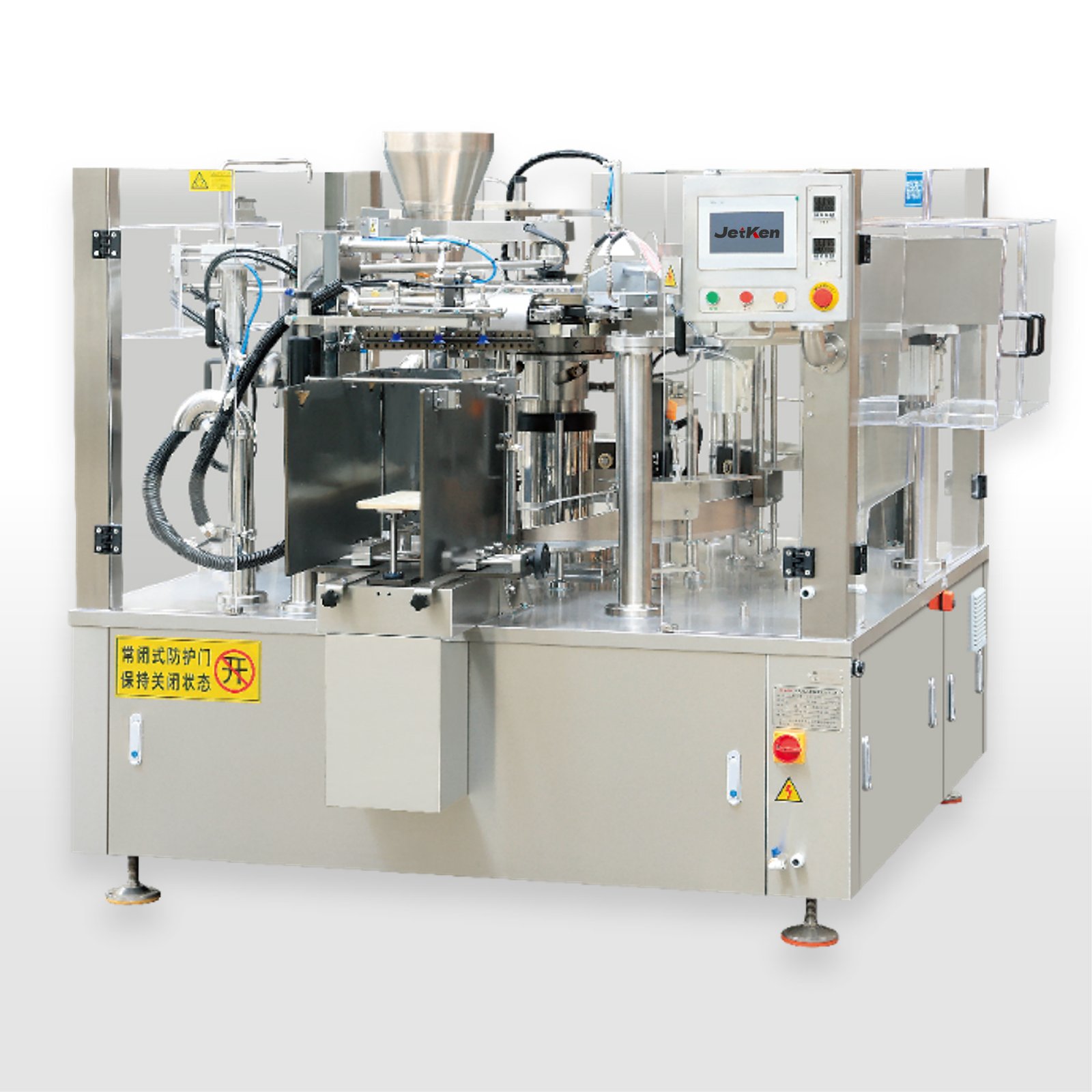 The JK8-400 is suitable for large-sized prefabricated bags. It has a turntable structure and multiple stations for product packaging. It includes functions such as robotic arm bag gripping, online coding, robotic arm bag opening, material feeding, bag mouth cleaning, venting, and sealing, which stably and efficiently produce standardized and aesthetically pleasing products. It can be paired with different feeding systems to achieve conventional packaging of various pre-made bags.